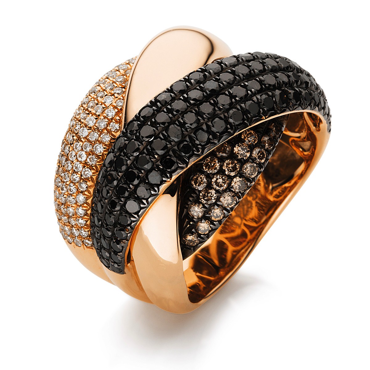 ring 18 kt RG, partly black rhodium plated, 97 diamonds 0,38 ct, G-si, 36 diamonds 0,51 ct, brown, 96 diamonds 1,52 ct, black, width:55
