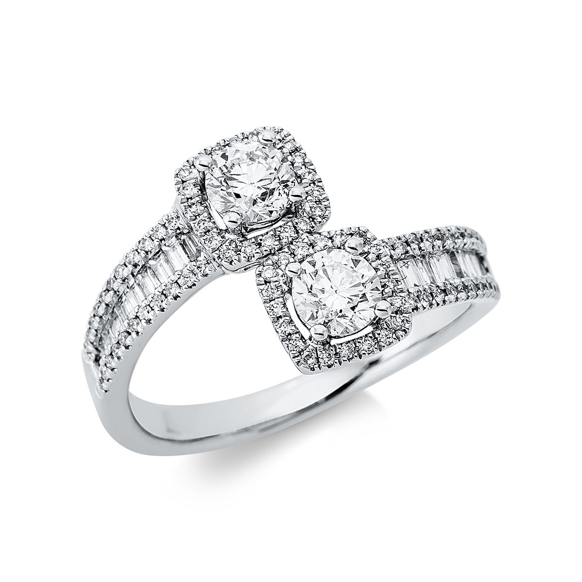 ring 18 kt WG, 2 diamonds 0,61 ct, G-si, 20 tapers 0,26 ct, G-si, 84 diamonds 0,16 ct, G-si, width:53