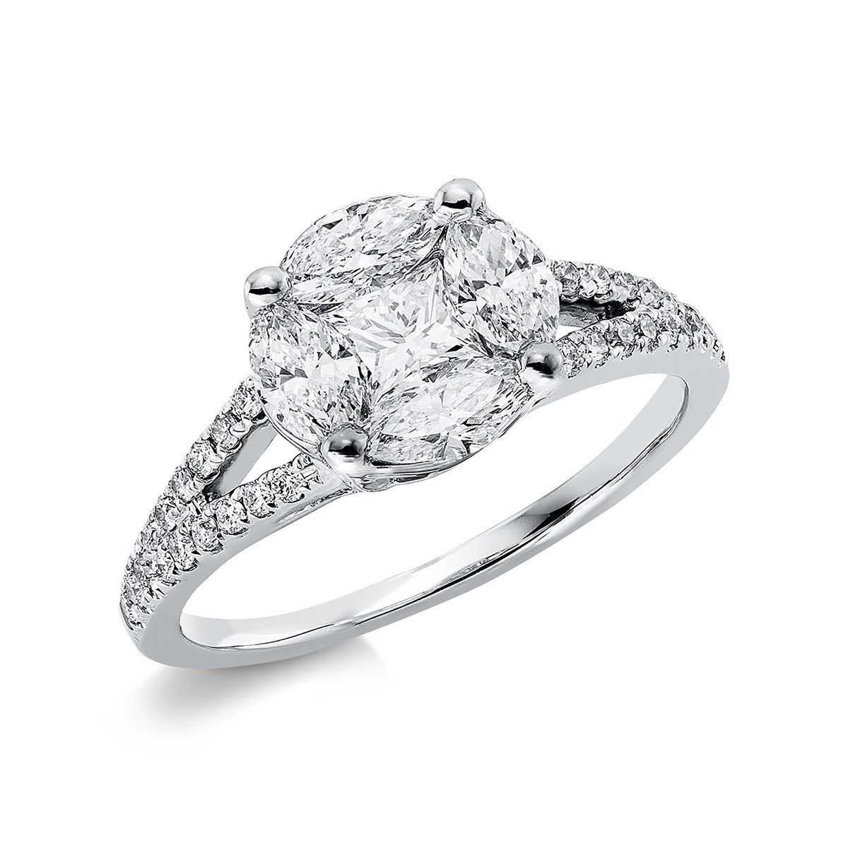 ring 18 kt WG, 4 marquise 0,74 ct, G-si, 1 princess 0,34 ct, G-si, 30 diamonds 0,21 ct, G-si, width:54